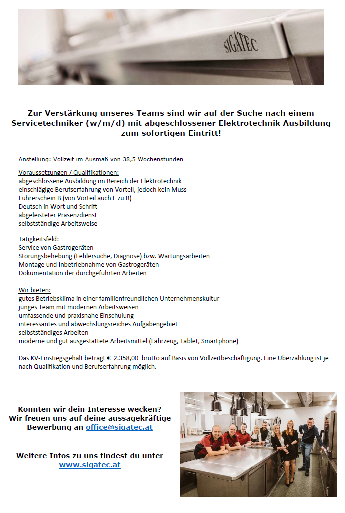 Bitte um telefonische Anmeldung unter +43 7412 56028 oder via E-Mail an office@sigatec.at