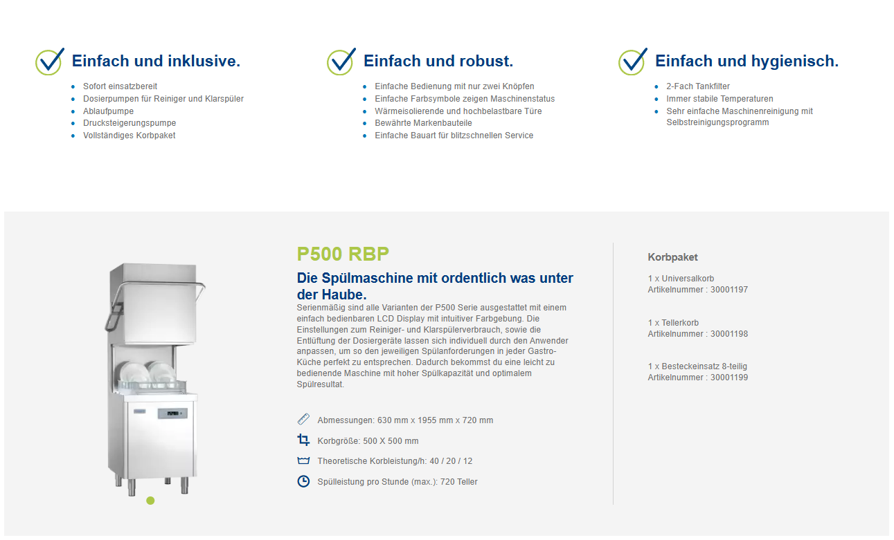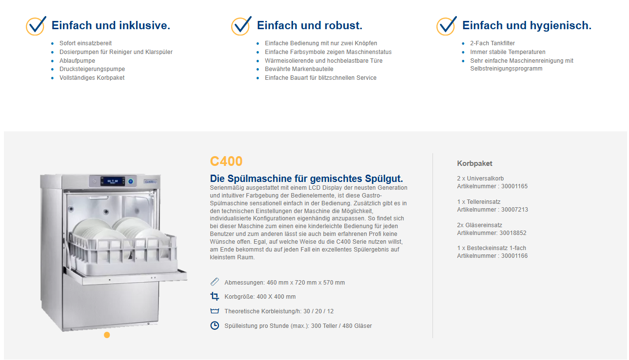 Modell | Gläserspülmaschine C400, Geschirrspülmaschine C500, Geschirrspülmaschine C500 DD, Geschirrspülmaschine C500 WS, Geschirrspülmaschine C500 WS DD, Haubenspülmaschine P500, Haubenspülmaschine P500 verstärkte Boilerheizung |
